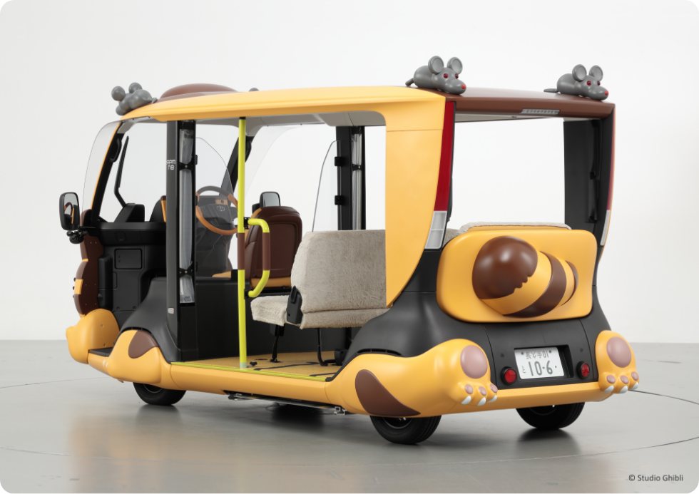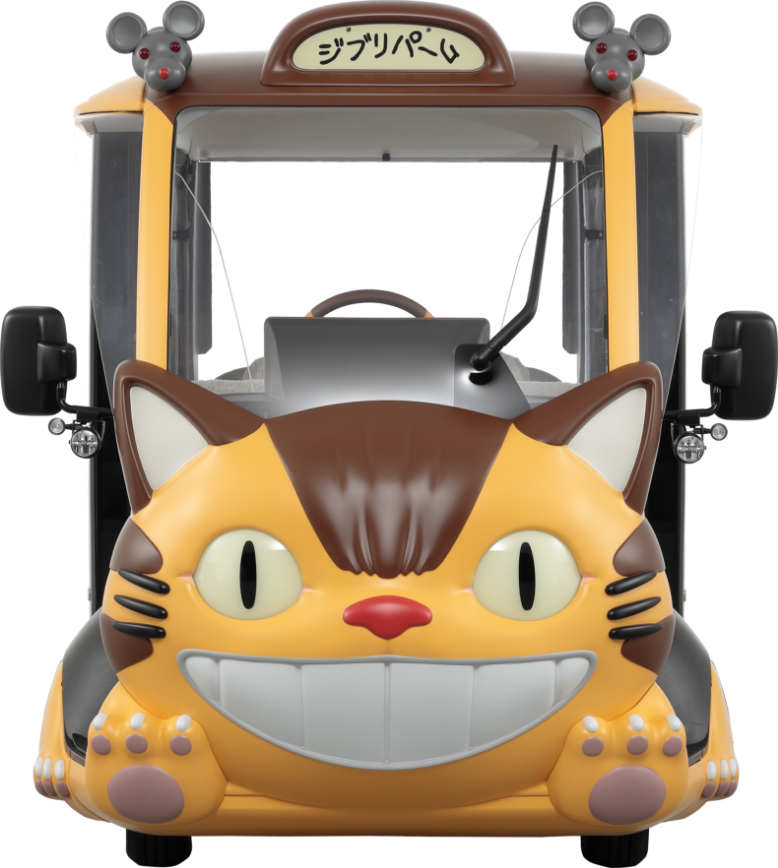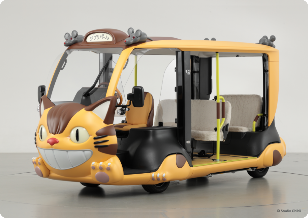 「APMネコバス」とはトヨタ自動車が開発した短距離・低速型モビリティ「APM(Accessible People Mover)」をベースに、スタジオジブリ宮崎吾朗監督監修のもと、スタジオジブリの映画作品『となりのトトロ』に登場するキャラクター「ネコバス」をイメージして製作された車両です。